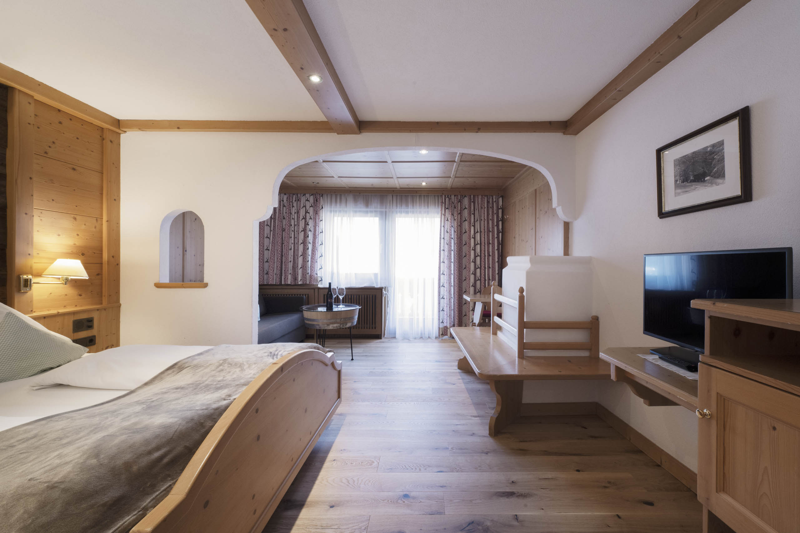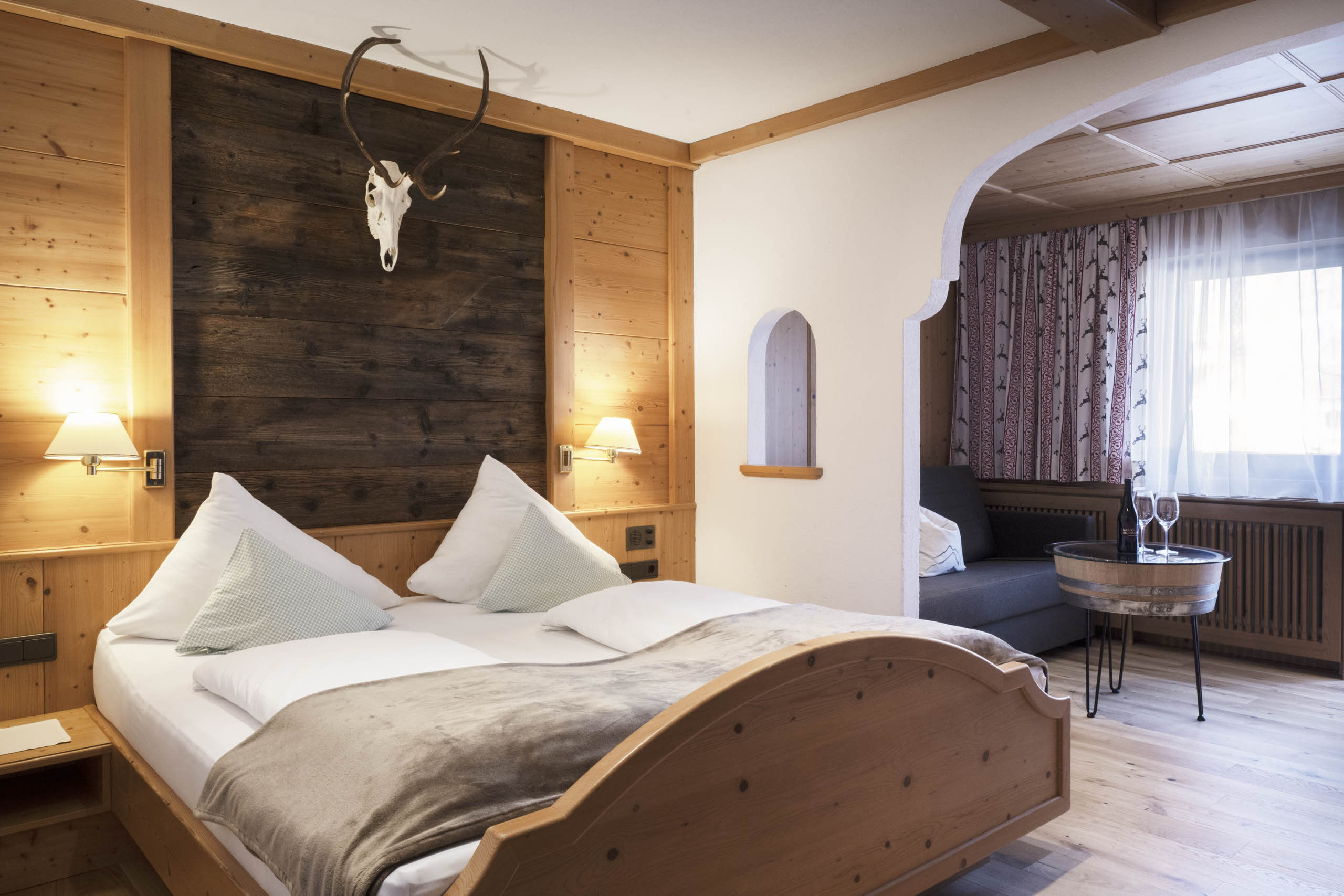 Balkon mit Bergblick, Doppelbett, teilweise Couch (mit Schlafmöglichkeit für ein bis zwei Personen auf Anfrage) oder